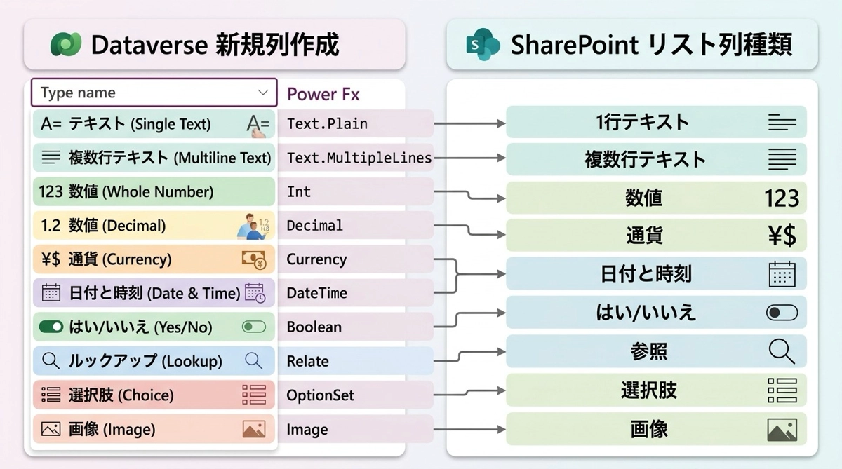 まとめとして、SharePointとDataverseの列データ型の対応を整理します。