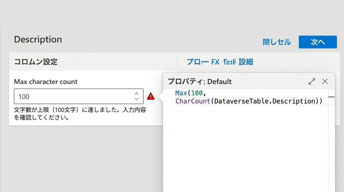 SharePointの単一行テキストはデフォルト255文字ですが、Dataverseは100文字がデフォルトです。変更しなければ100文字を超える入力が切り捨てられます。最大400文字まで拡張できますが、SharePointから移行するつもりで設計するなら255文字に揃えておくのが無難です。変更手順と文字数制限の詳細についてはDataverseのテキスト列文字数設定の記事でまとめています。