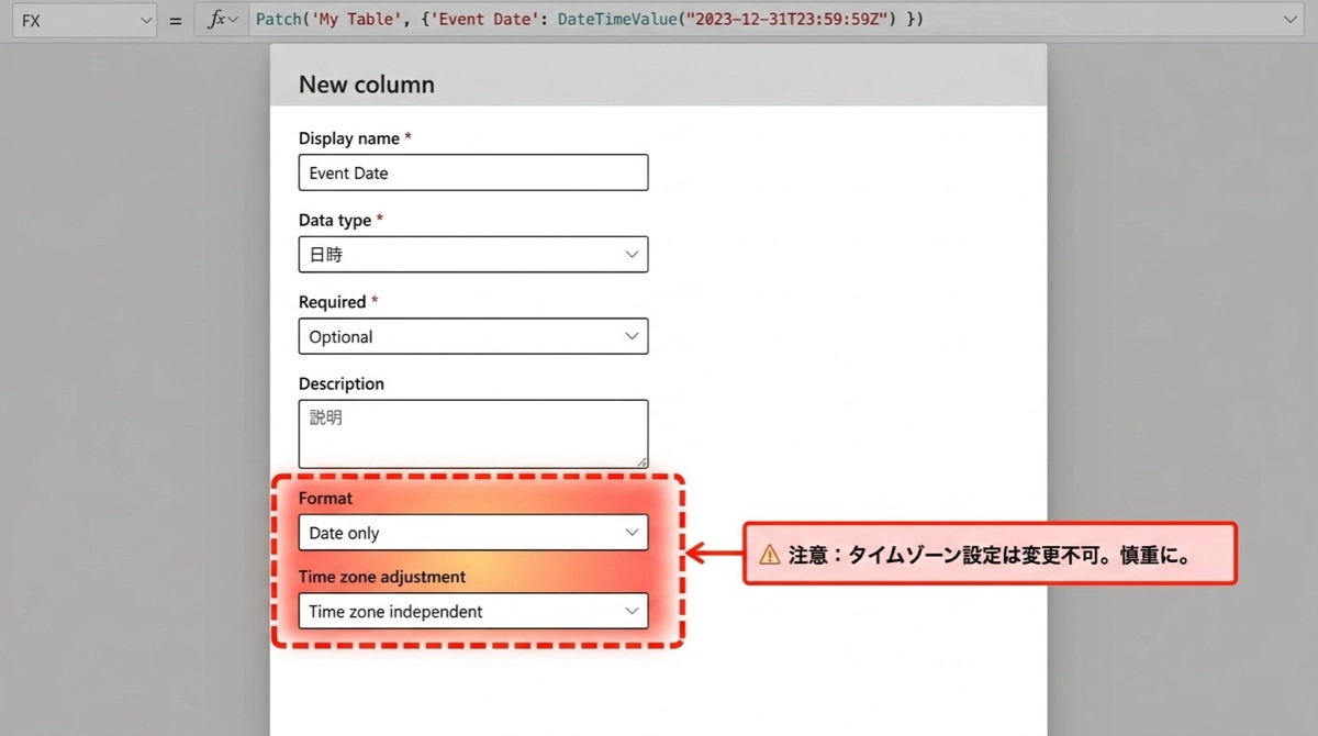 この問題を防ぐには、列作成時にadvanced optionsのTime Zone設定でTime Zone Independentを選ぶ必要があります。この設定は作成後に変更できません。詳しい仕組みと対処法はDataverseの日付タイムゾーン設定の記事で解説しています。日付列を作るときは必ずこの記事を確認してから設定するようにしています。