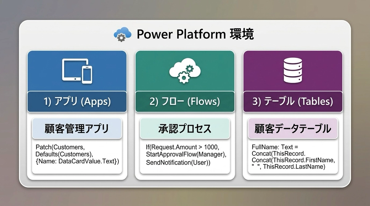 一つの環境の中には、Dataverseのテーブルだけでなく、その環境に紐づくPower Appsのアプリ、Power Automateのフロー、Power BIのレポートなども含まれます。つまり環境は、Power Platformで作るものすべての入れ物です。