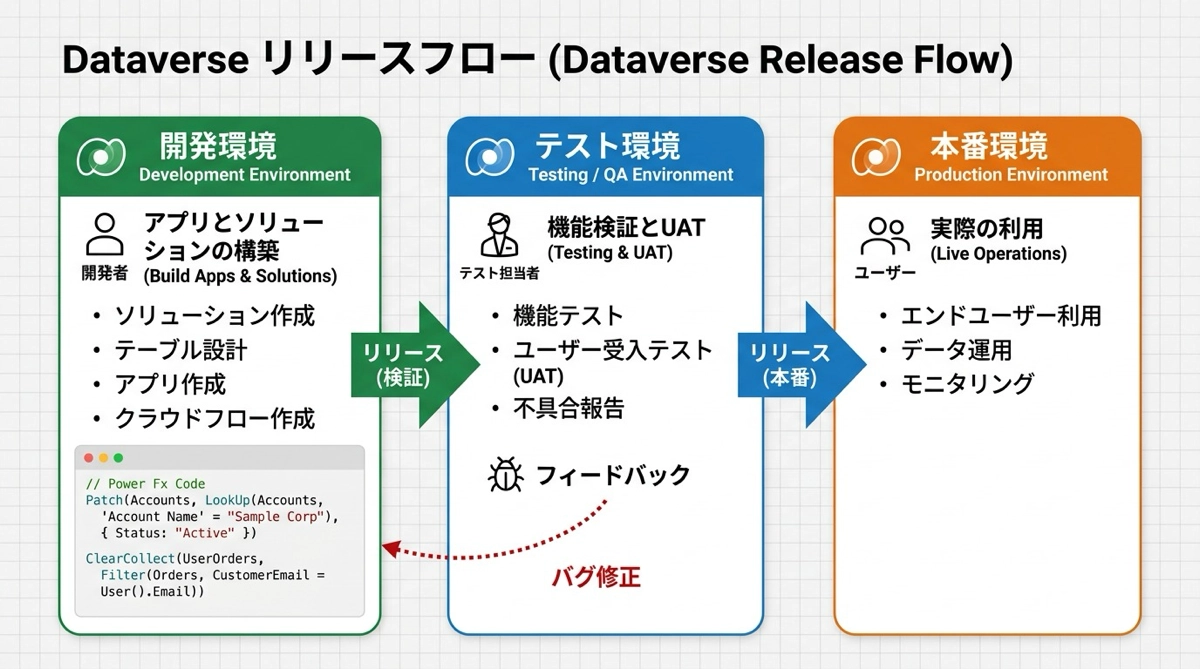 組織のPower Platform管理者がPower Platform管理センター(admin.powerplatform.microsoft.com)で作成する環境です。アクセス権限・データ保護ポリシー・Dataverseの有効化などを管理者が設定します。