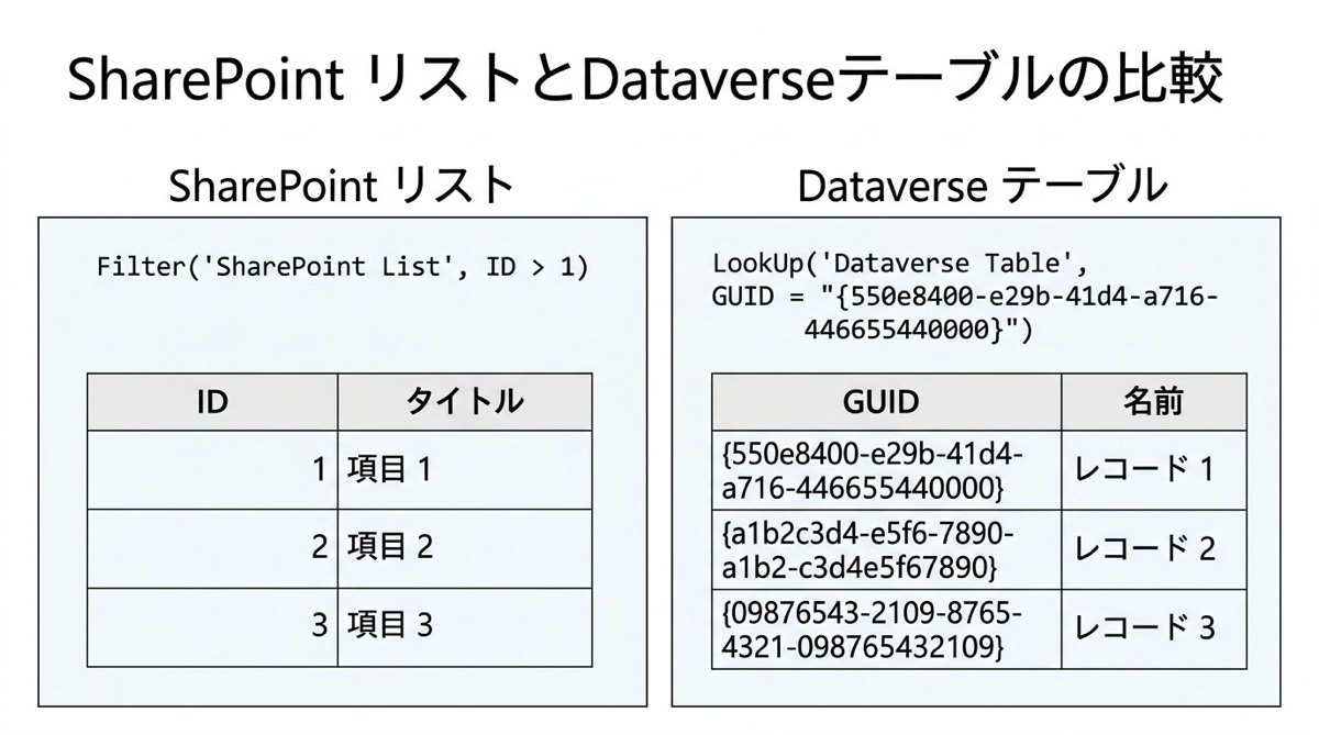 SharePointのIDに慣れていると「DataverseにはなぜわかりやすいIDがないんだ」と感じることもあります。でも、GUIDはグローバルなシステム間連携を想定した仕様です。SharePointは社内の小規模リストを想定した連番、Dataverseはエンタープライズ規模のデータ管理を想定したGUID、という設計思想の違いとして理解しておくと気持ちが楽になります。