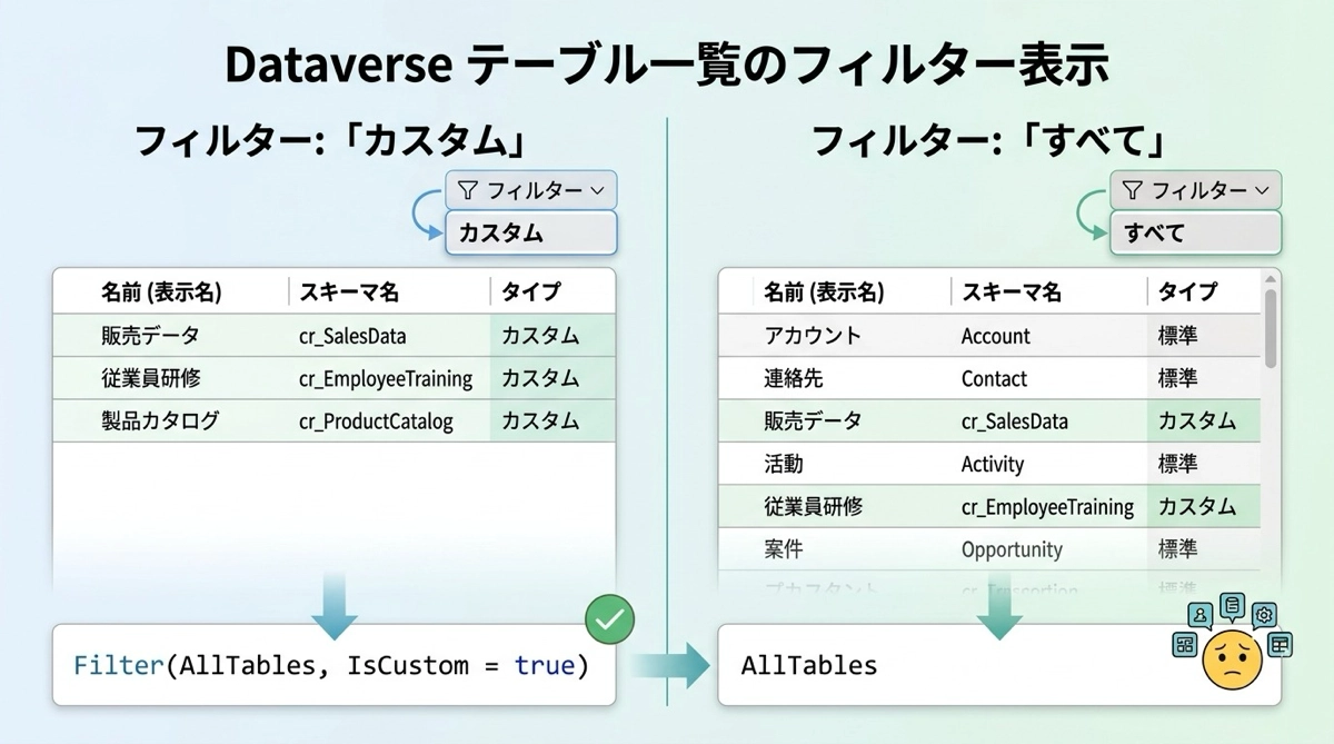 Dataverseを開いて大量のテーブルに驚いたとしても、それらのほとんどは標準テーブルであり、Canvas appを作るだけであれば直接関わる必要はありません。テーブル一覧は「カスタム」フィルターで絞り込んで使うのが日常の操作として正解です。