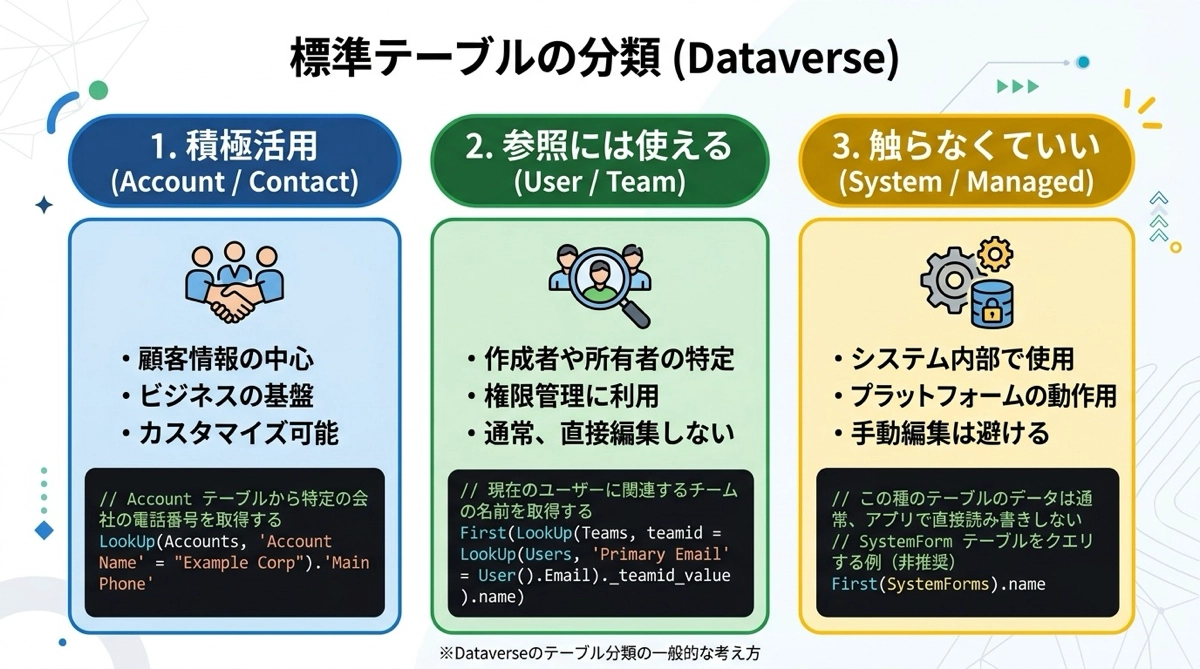 Canvas appを独自に作るだけが目的であれば、これらの標準テーブルはほとんど使いません。Dynamics 365との連携や、Model-driven appsの構築を前提とした場合に意識する必要が出てきます。