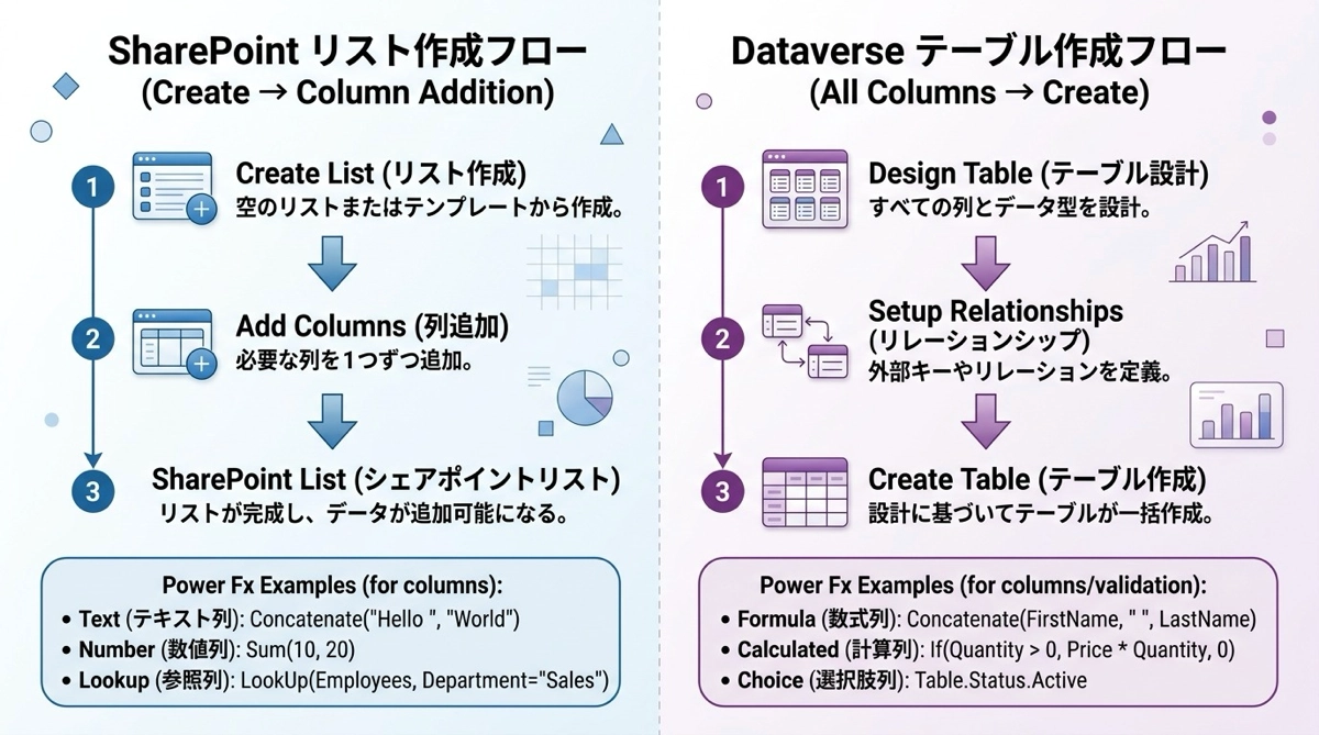料理でいうと、SharePointは冷蔵庫にあるものを見ながら何を作るか決めるスタイル、Dataverseは最初にレシピを完成させてから買い物に行くスタイルです。どちらが良い悪いではなく、設計の文化が根本的に違います。