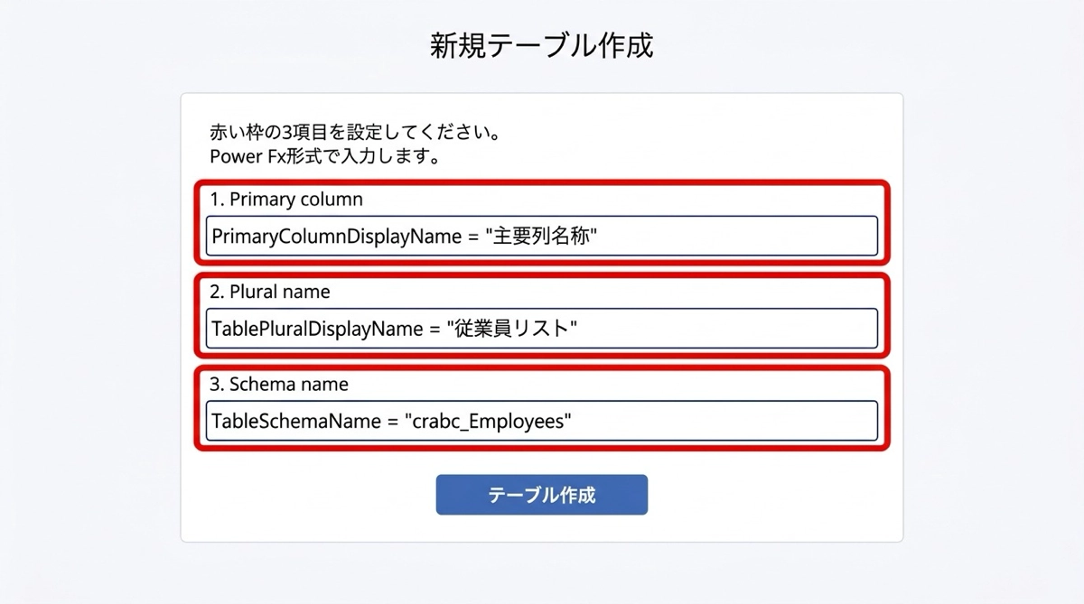 | ① | 空のリストを作成・保存 | テーブル名・プライマリ列を設定 |
