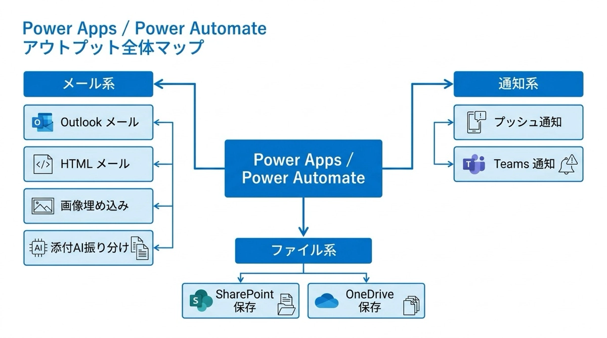 Power Apps / Power Automate から何かを送り出す手段は、メール・プッシュ通知・Teams 通知・ファイル保存など複数あります。それぞれを個別に覚えていくより、全体像を先に把握してから選ぶほうが設計がブレません。この記事では、私が現場で使っているアウトプットのパターンをすべて整理します。