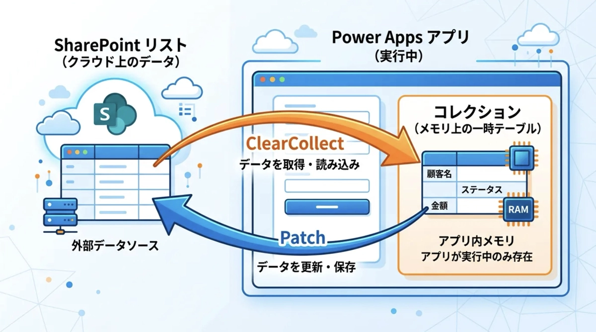 コレクションとは、Power Appsアプリのメモリ上に存在する一時的なデータテーブルです。SharePointリストやExcelとは異なり、アプリを閉じると消えます。永続的に保存したいデータはSharePointなどのデータソースに書き込む必要があります。