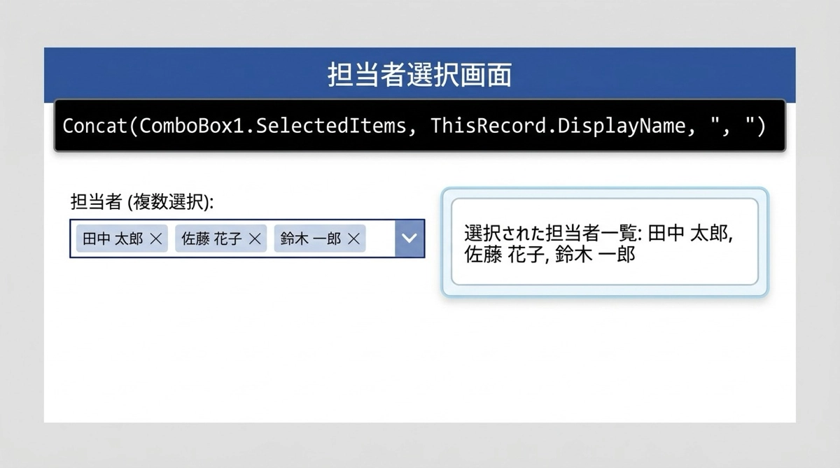 Concatは「テーブルを文字列に変換する関数」です。コンボボックスの複数選択をメール宛先にする、コレクションの内容をまとめて表示する、といった場面で繰り返し使います。