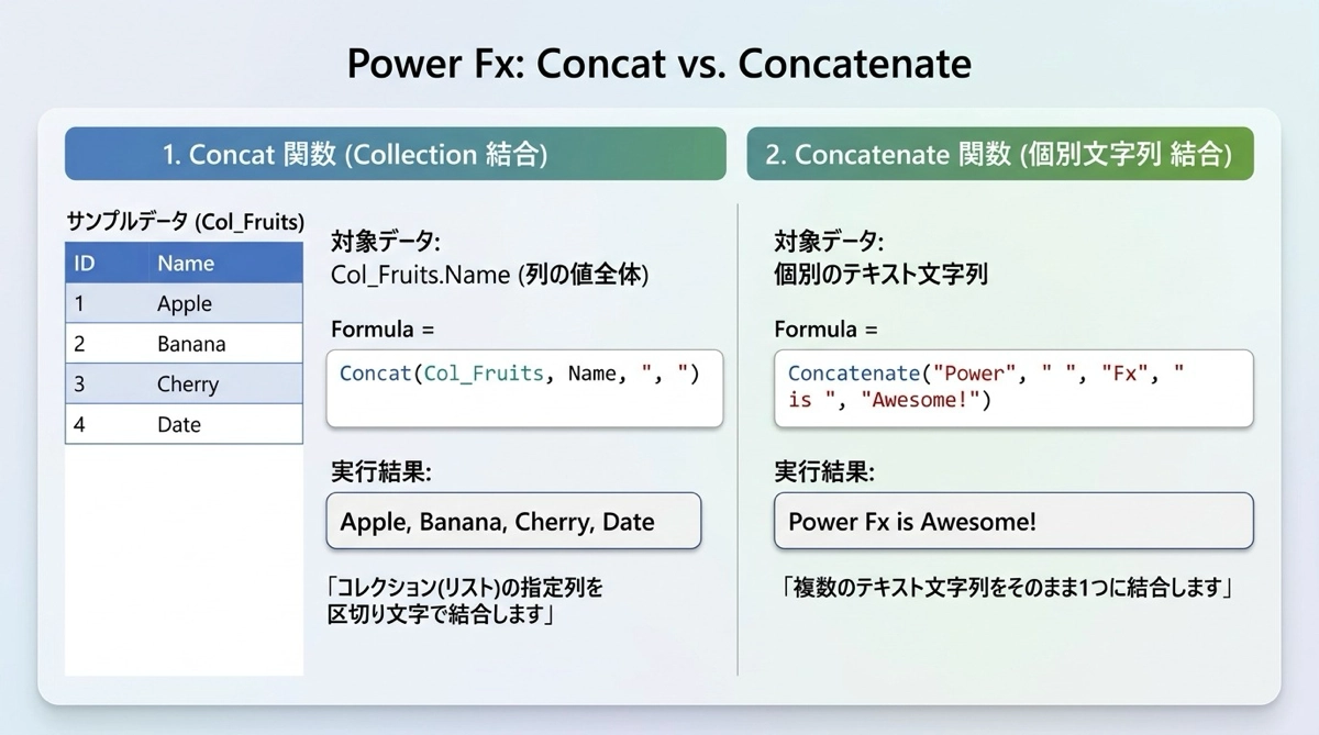 Power Appsには文字列を結合する関数が2つあります。まず違いを整理しておきます。