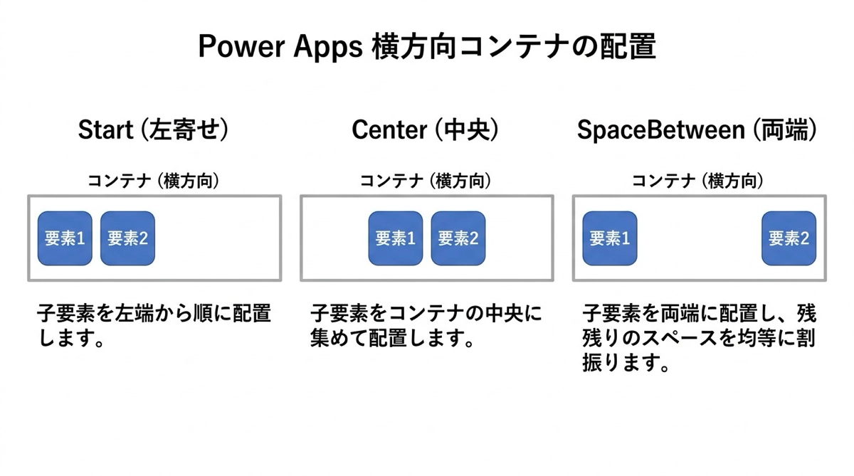 SpaceBetween が特に便利で、最初の子要素をコンテナの先頭に、最後の子要素をコンテナの末尾に配置し、残りを等間隔に並べます。たとえばヘッダーバーの左端にタイトル、右端に更新ボタンを置きたいとき、横コンテナに2つの要素を入れて LayoutJustifyContent を SpaceBetween にするだけで実現できます。私のアプリでも cntBI_1stL(KPIカードの上段コンテナ)でこのパターンをよく使っています。Gap で間隔を細かく調整するより、SpaceBetween のほうがスッキリ書けます。