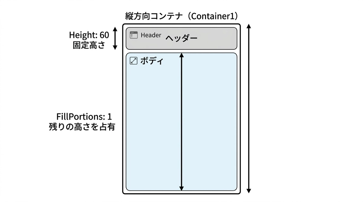 FillPortions は固定サイズと組み合わせて使うとさらに強力になります。たとえばヘッダーの高さを Height: 60 で固定し、残りのボディ部分に FillPortions: 1 を設定すると、ヘッダーは常に60pxを確保しつつ、ボディが残りの高さをすべて占有します。画面の高さが変わってもヘッダーは60pxのまま、ボディだけが伸び縮みします。