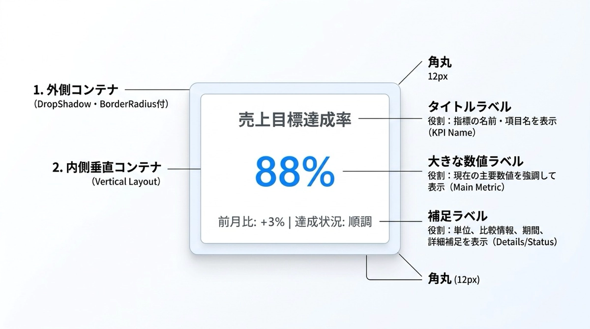 KPIカードは2層のコンテナで作ります。外側コンテナがカードの見た目(DropShadow・BorderRadius・Fill)を担当し、内側コンテナがコンテンツのレイアウト(Padding・整列)を担当します。内側はAuto Layout の垂直コンテナにして、タイトルラベル・数値ラベル・補足ラベルを上から順に積み上げます。