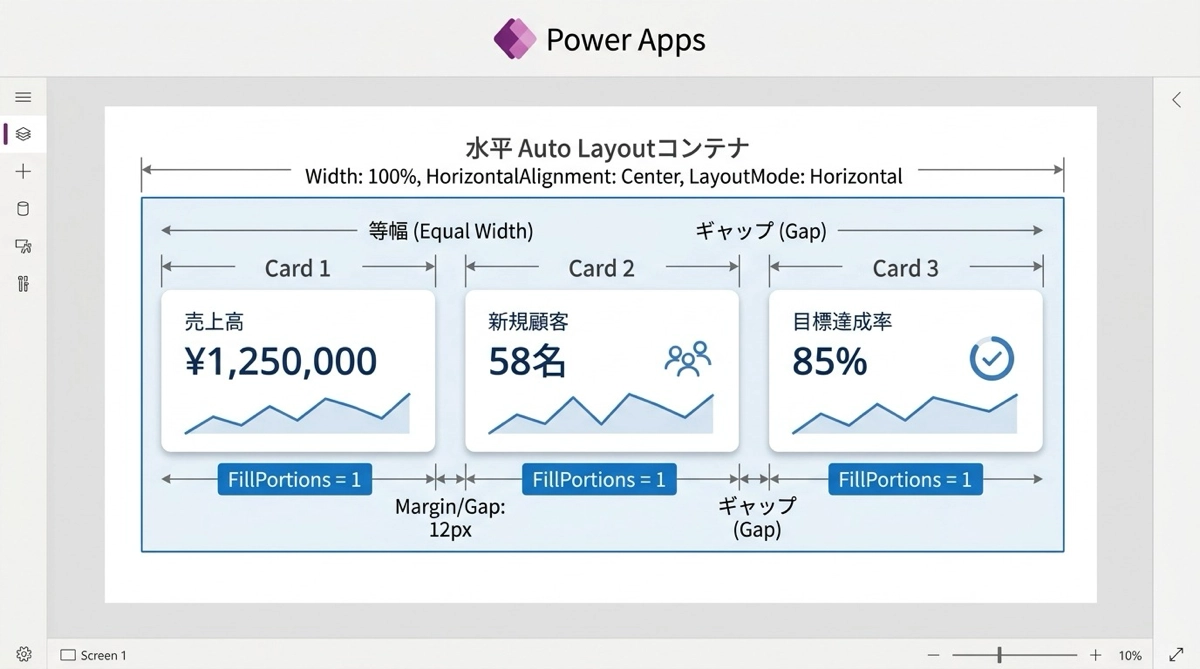 Power Apps でダッシュボードを作るとき、KPIカードは画面の顔になります。今月の件数・前月比・直近7日間の3枚を横並びで並べて、アプリを開いた瞬間に現場の状況が把握できるようにする。コンテナを使えばこのレイアウトを崩れなく、メンテナンスしやすい構造で実装できます。