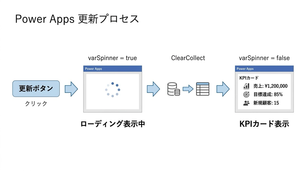 KPIカードのデータは画面を開いたときと更新ボタンを押したときに取得します。更新ボタンの OnSelect に ClearCollect を書いて、取得中はスピナーを表示する設計が使いやすいです。