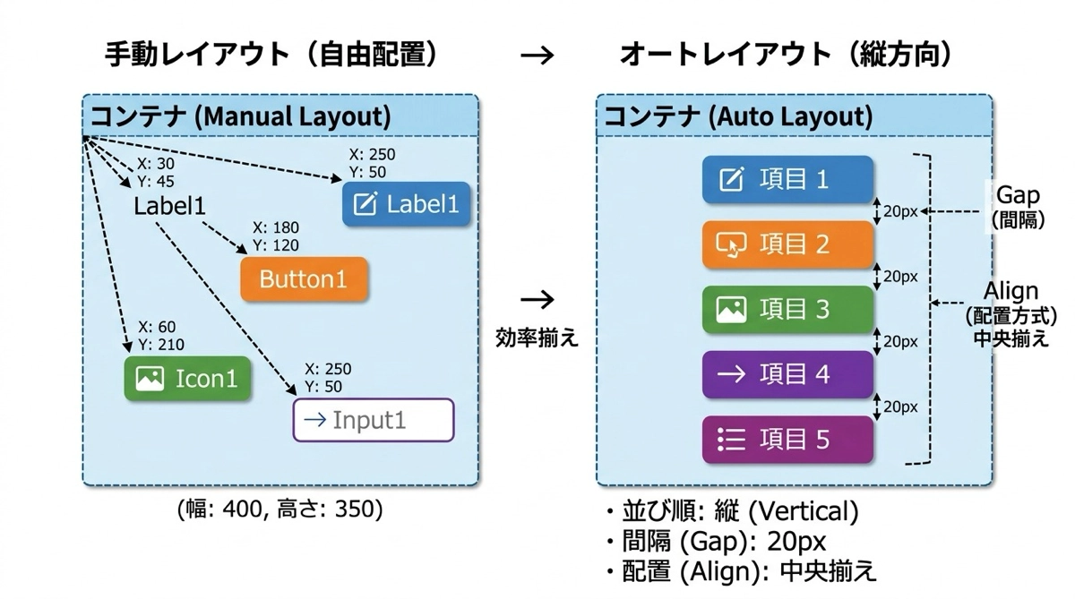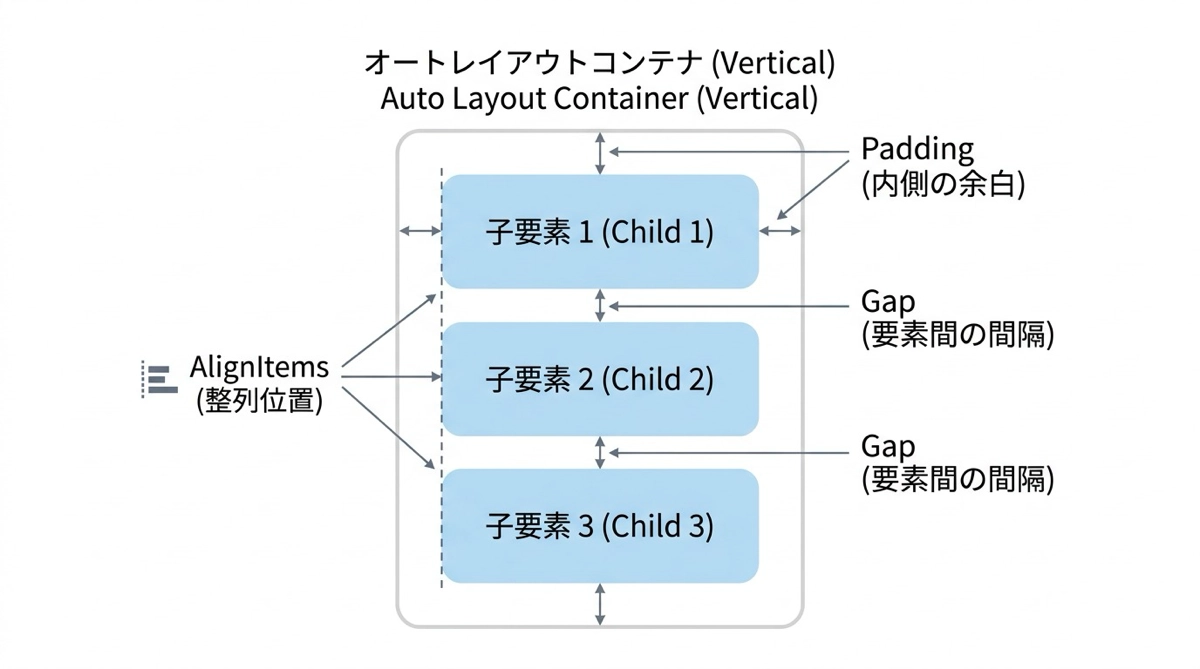 オートレイアウトは、コンテナ内の子要素を縦方向(Vertical)または横方向(Horizontal)の一方向に自動的に並べる方式です。子要素の間隔・整列・折り返しを Wrap・Gap・Align などのプロパティで一元管理できます。子コントロールの X・Y 座標は自分では設定せず、コンテナが自動的に計算して並べます。