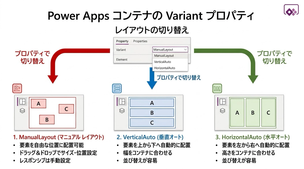 コンテナを挿入した後でも、Variant(バリアント)プロパティを変更すれば手動レイアウトとオートレイアウトを切り替えられます。値は ManualLayout か VerticalAuto・HorizontalAuto のいずれかです。