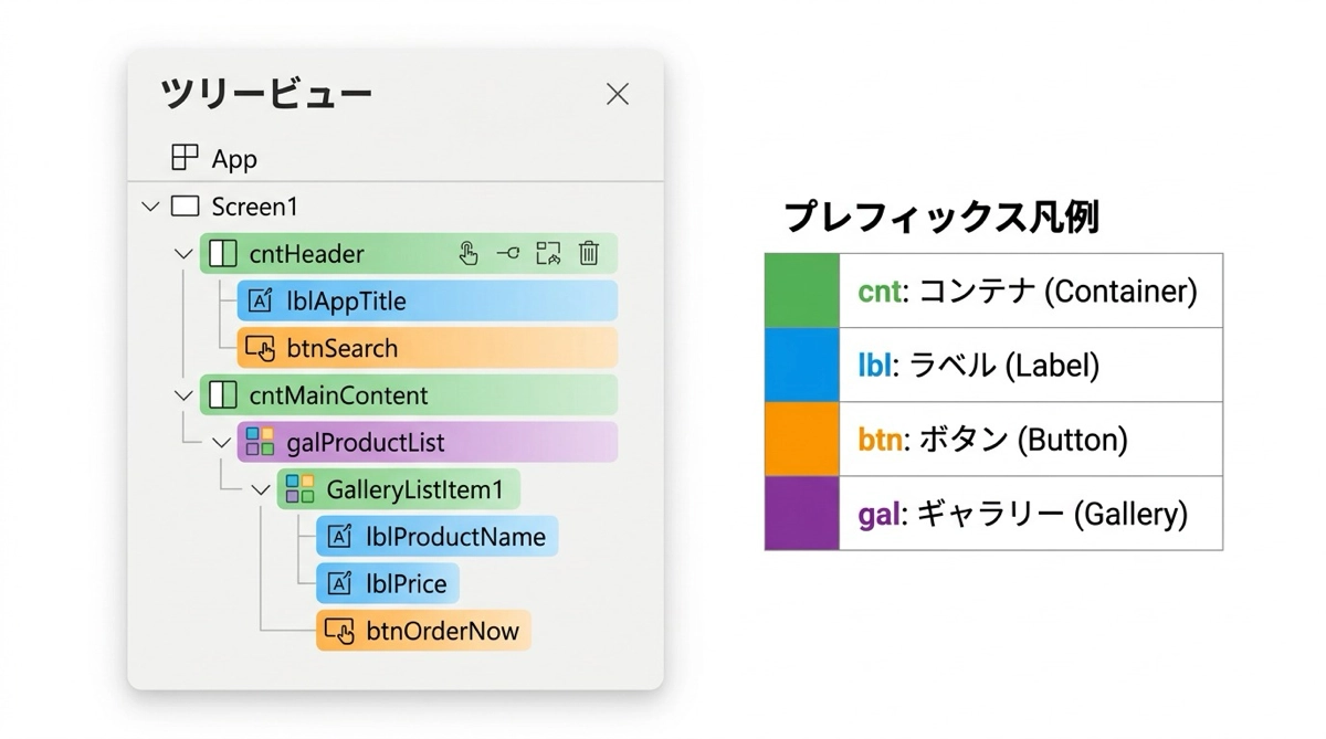 命名規則は地味な作業ですが、その恩恵はアプリが大きくなるほど効いてきます。最初にルールを決めてしまえば、後から名前を付け直す作業がほぼなくなります。プレフィックス・場所・役割の3要素を名前に含めるだけで、ツリービューの可読性は大きく変わります。