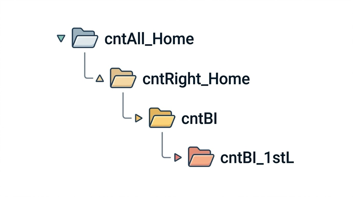 この命名を見るだけで、ツリービューのどこを開けばよいかが名前から推測できます。1stL・2ndL という連番は1行目・2行目の意味で、L は Left(左)を指しています。コンテナのネスト構造の設計についてはコンテナのネスト構造を作る方法で詳しく解説しているので、階層設計と合わせて読んでもらえると理解が深まります。