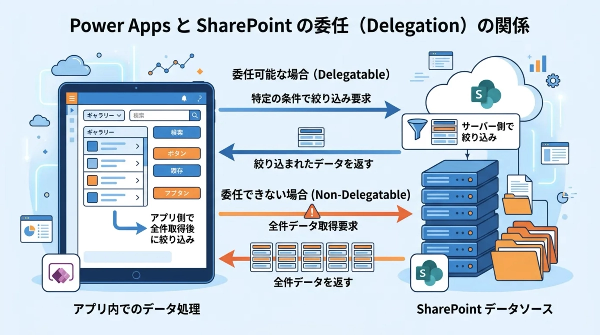 Power Appsは基本的に、フィルターや並び替えの処理をデータソース(SharePointやDataverseなど)のサーバー側に委任して実行します。これが委任という仕組みです。委任できれば、データが何万件あっても条件に合うものだけをきちんと取得できます。ところが、データソースやPower Appsが対応していない処理の組み合わせでは、委任が成立しません。