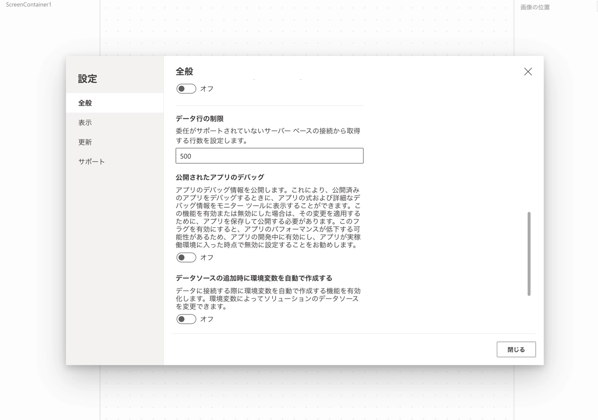 Power Appsの設定から、データ行の制限を最大2000件まで引き上げることができます。Power Appsスタジオのメニューから 設定 → 全般 を開き、データ行の制限の値を変更します。デフォルトは500件です。