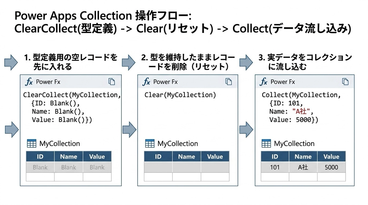 コレクションの列型は最初のレコードで決まります。ところが実データで ClearCollect すると、数値列が文字列になってしまったり、日付型が崩れるケースがあります。これを防ぐため、空のレコードを先に ClearCollect してから本データを Collect する方法があります。