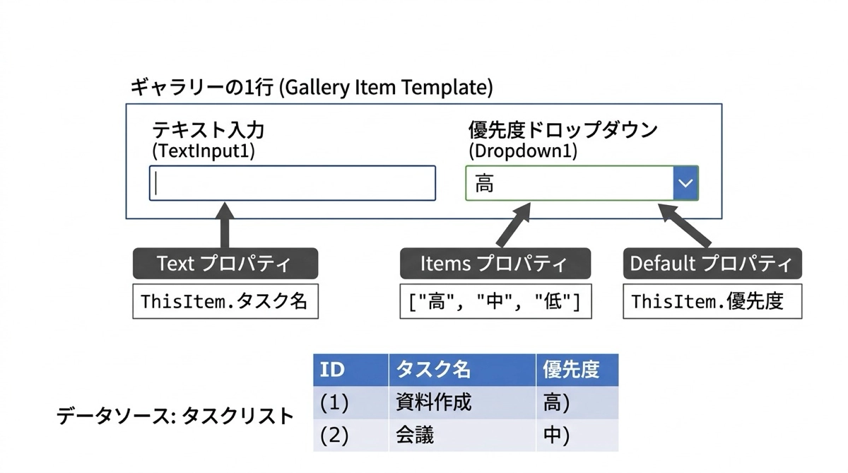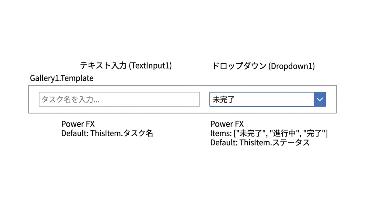 ギャラリーのテンプレートに TextInput・Dropdown・ラベルを配置して、編集グリッドを構成します。TextInput は編集可能な列、ラベルは読み取り専用で表示したい列に使います。