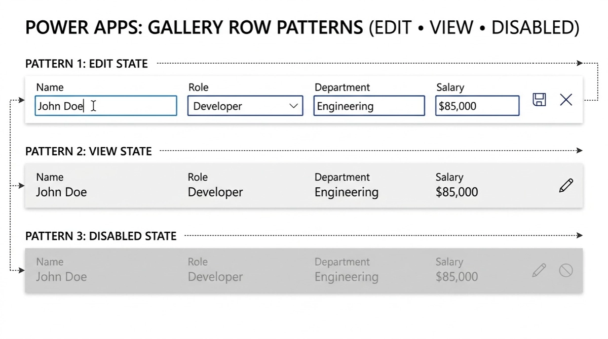 編集グリッドとは、ギャラリーの各行にテキスト入力・ドロップダウンなどの入力コントロールを配置して、Excelのような行編集UIを実現したものです。通常のギャラリーは読み取り専用のリスト表示ですが、編集グリッドは行ごとに値を直接変更できます。