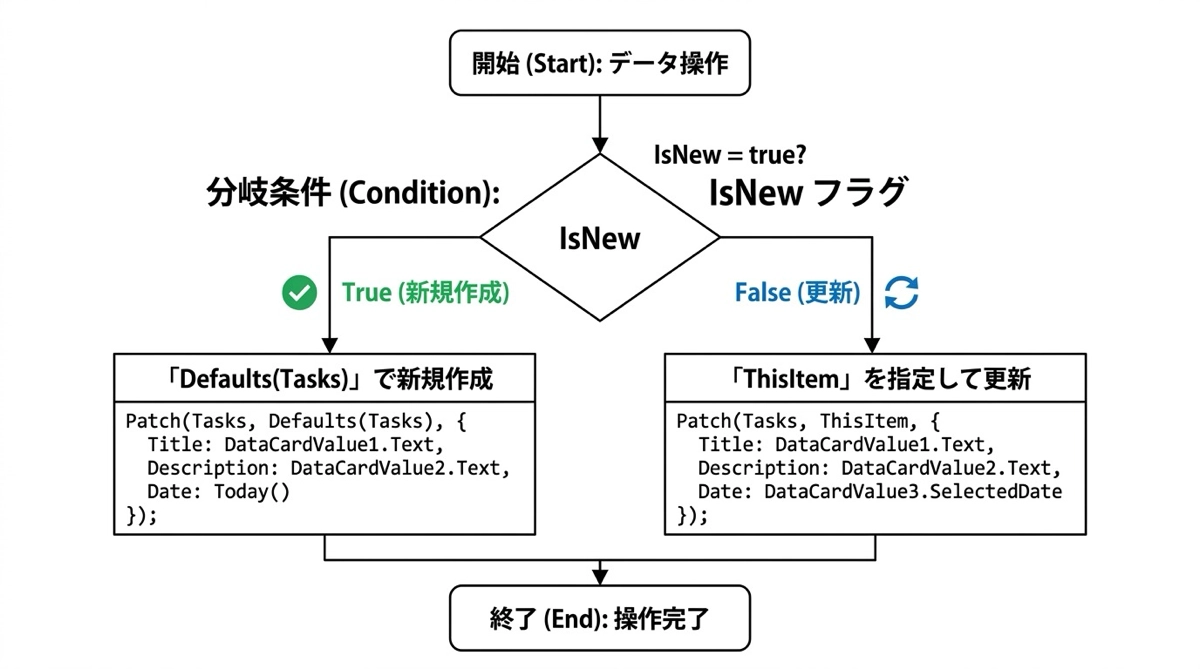 IsNew が true の場合は Defaults(Tasks) を使って新規レコードとして作成し、false の場合は ThisItem を指定して既存レコードを更新します。Defaults(Tasks) はデータソースのデフォルト値を持つ空のレコードを返します。これが新規作成のサインです。