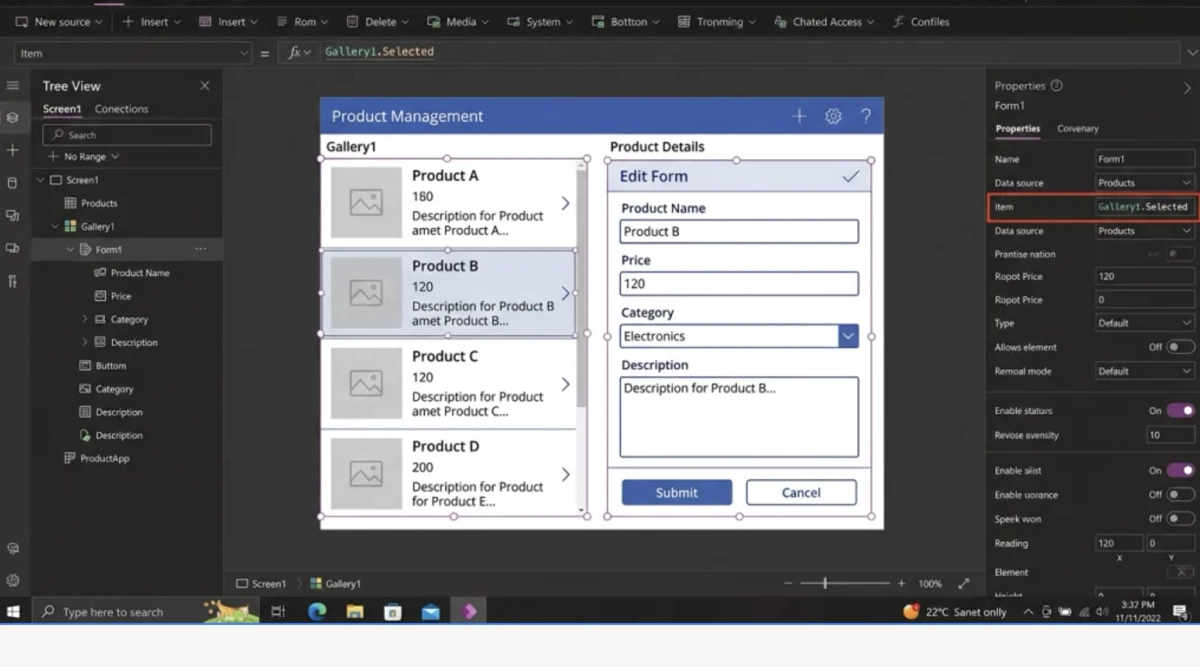 EditモードでフォームにレコードをバインドするにはItemプロパティの設定が必要です。ギャラリーで選択したレコードをフォームに渡すには、フォームのItemプロパティに次のように書きます。