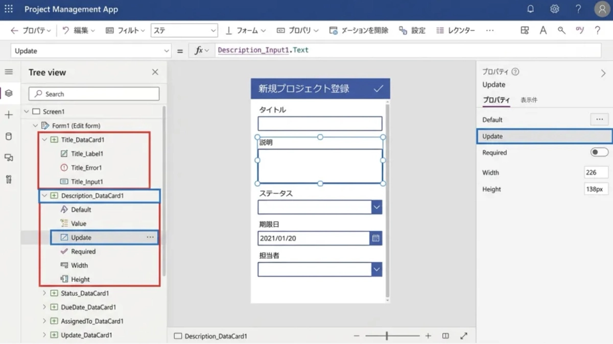 フォームコントロールを画面に追加すると、データソースの各列が自動的にカードコントロールとして並びます。カードはフォームの子コントロールであり、各フィールドの入力欄をカプセル化したものです。