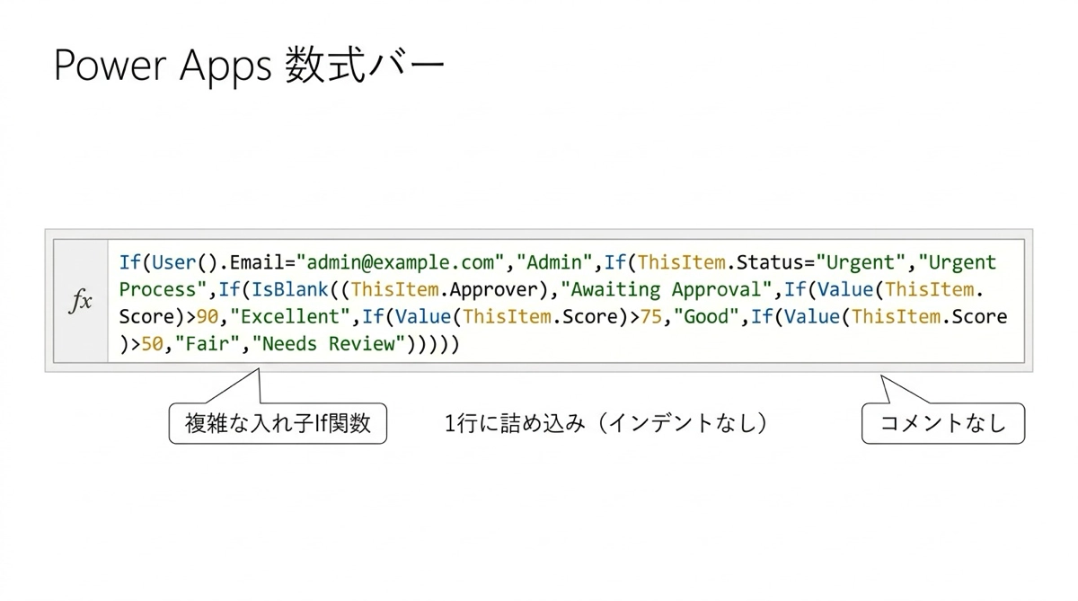 Power Appsを使い始めて少し慣れてくると、複雑な条件分岐や計算式を書けるようになります。でもその式が長くなればなるほど、後から読み返したときに、これ何をやっているんだろうと迷子になりがちです。