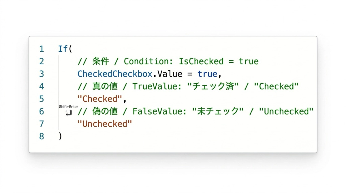 Power Appsの数式エディタでは、Shift+Enterで改行を入力できます。これだけで式の読みやすさが大きく変わります。
