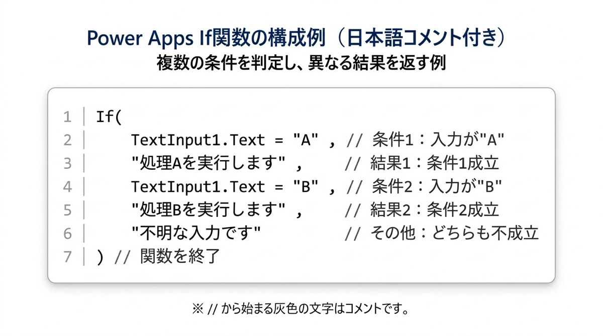 Power Appsの数式エディタでは、// 以降をコメントとして記述できます(その行の末尾まで)。コメントは実行時に無視されるので、動作に影響はありません。