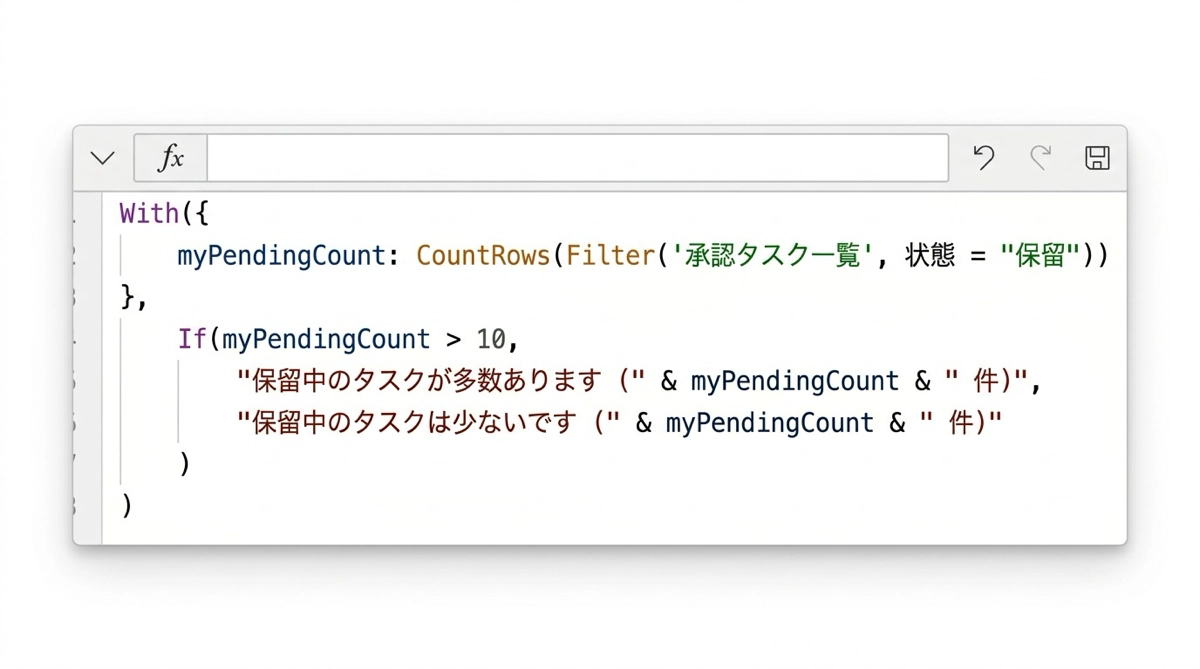 変数名 myPendingCount が自分担当の未処理件数であることを明示しています。式が1回しか書かれていないため、条件を変えたいときも1箇所だけ直せばよいです。