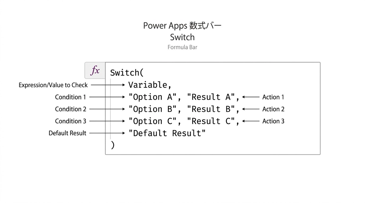 Switch関数は、この変数が○○のときは△△、□□のときは▲▲という構造を表現するのに最適です。条件の種類が増えても、縦に追加するだけで対応できます。
