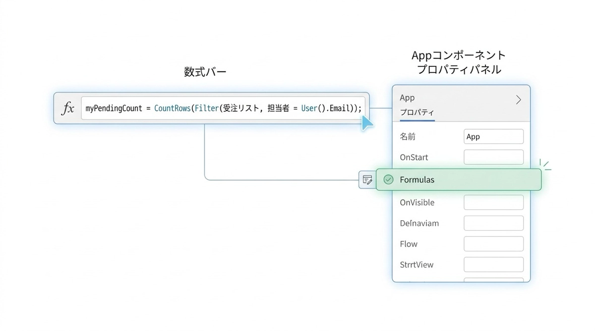 こうすることで、アプリの任意のコントロールから myPendingCount という名前で参照できます。受注リストのフィルター条件を変えたいときも、App.Formulasの1箇所を修正するだけで、全コントロールに反映されます。