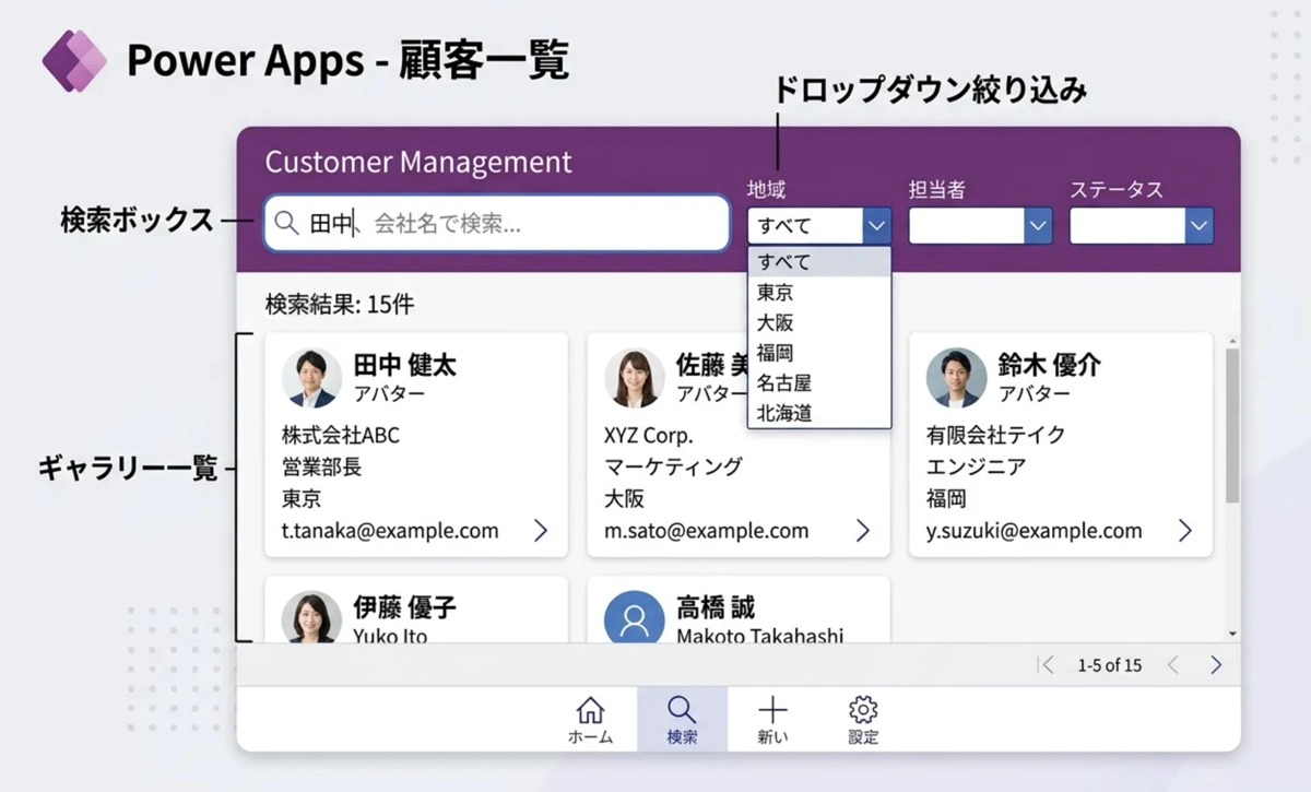 テキスト入力コントロールを検索ボックスとして使い、ギャラリーのItemsプロパティにSearch関数を組み合わせると、文字を入力するたびに一覧が絞り込まれます。