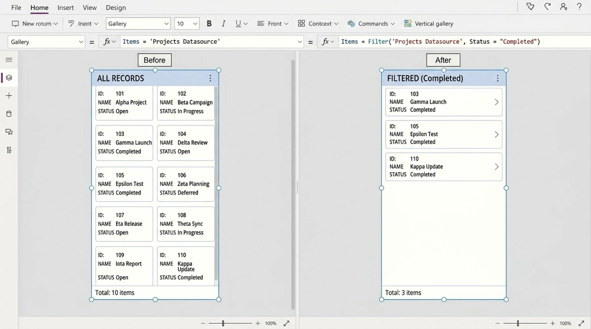 Filter 関数の使い方を覚えると、ギャラリーで表示するデータを自由に絞り込めるようになります。構文はシンプルですが、Dropdown との連動・委任の落とし穴まで理解しておくと、実務で詰まることが大幅に減ります。