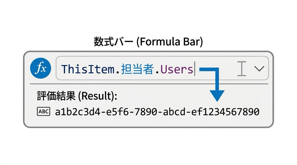 末尾の Users はリレーション先のテーブル名で、これが GUID(一意識別子)を返します。Dataverse の GUID についてはDataverseにIDがない理由|GUIDとは何かで解説しているので、仕組みを先に理解しておくとスムーズです。