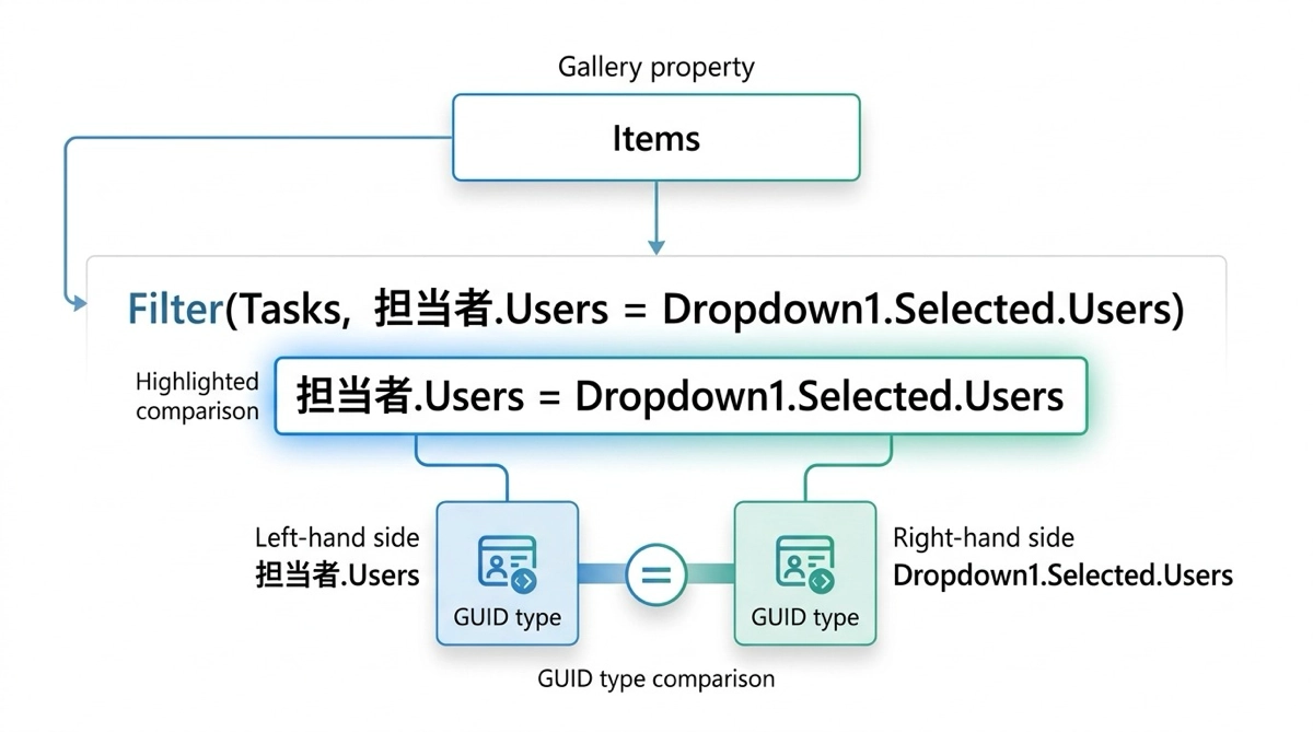 左辺の 担当者.Users がレコード側の GUID、右辺の Dropdown1.Selected.Users が Dropdown で選択された行の GUID です。同じ型同士の比較になるため、正しく一致判定が行われます。