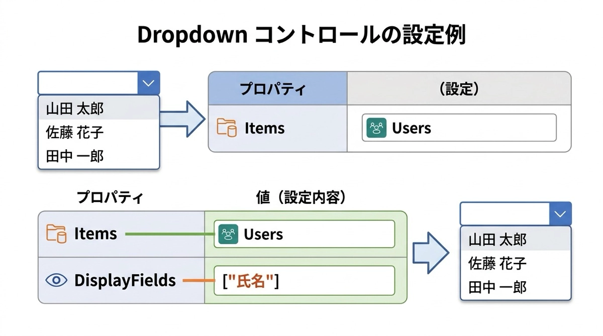 Dropdown の Items プロパティには Users テーブルをそのまま指定します。