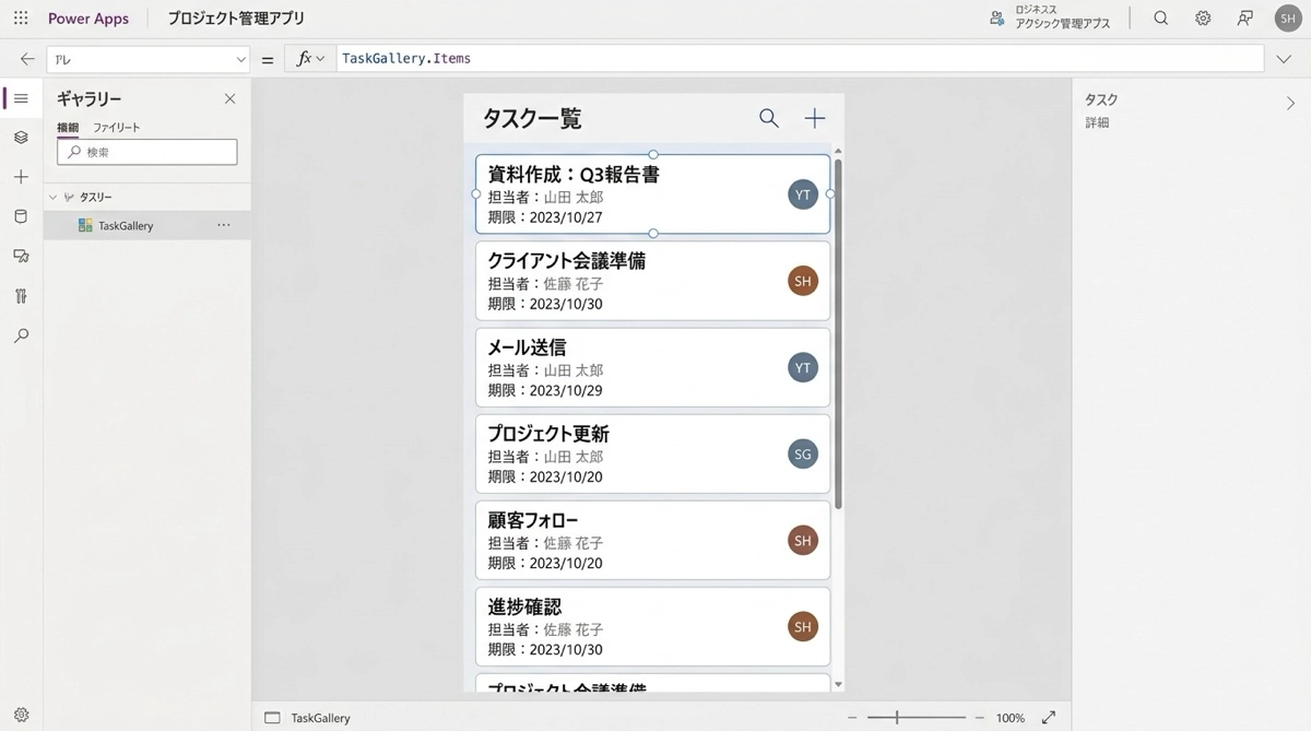ギャラリーのレイアウト設定の核心は、フィールドのバインドをコントロールすることです。ルックアップ列のドット記法、アンパサンドによる結合、Text 関数のフォーマット指定を押さえておくと、業務アプリらしいギャラリーを自在に作れるようになります。