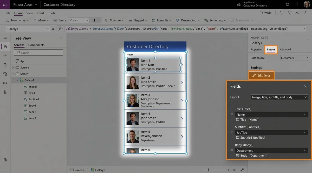 ギャラリーを挿入すると、Power Apps がデータソースの列を自動でひも付けします。しかしこの自動アサインが意図通りになることは少ないです。よくあるのが、Title1 に ID(数値)が入ってきて、本来表示したかった商品名や氏名が表示されない、というケースです。同じ経験をしたことがある方も多いはずです。
