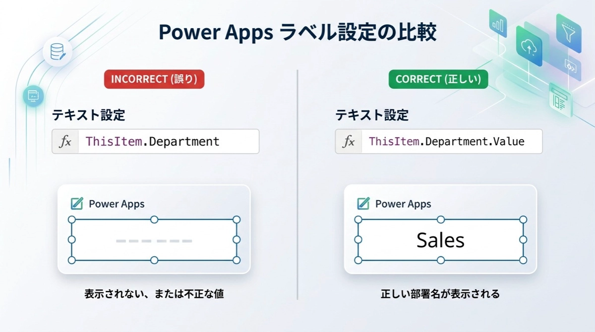 SharePoint のルックアップ列や Dataverse のリレーション列を表示するときは注意が必要です。単純に列名を指定しただけでは、テキストではなくオブジェクトそのものが返ってきます。ラベルに何も表示されなかったり、意味のない文字列が並んだりするのはこれが原因です。Power Apps がルックアップ列をレコード型として扱っているため、テキストとして表示するにはひと手間必要になります。