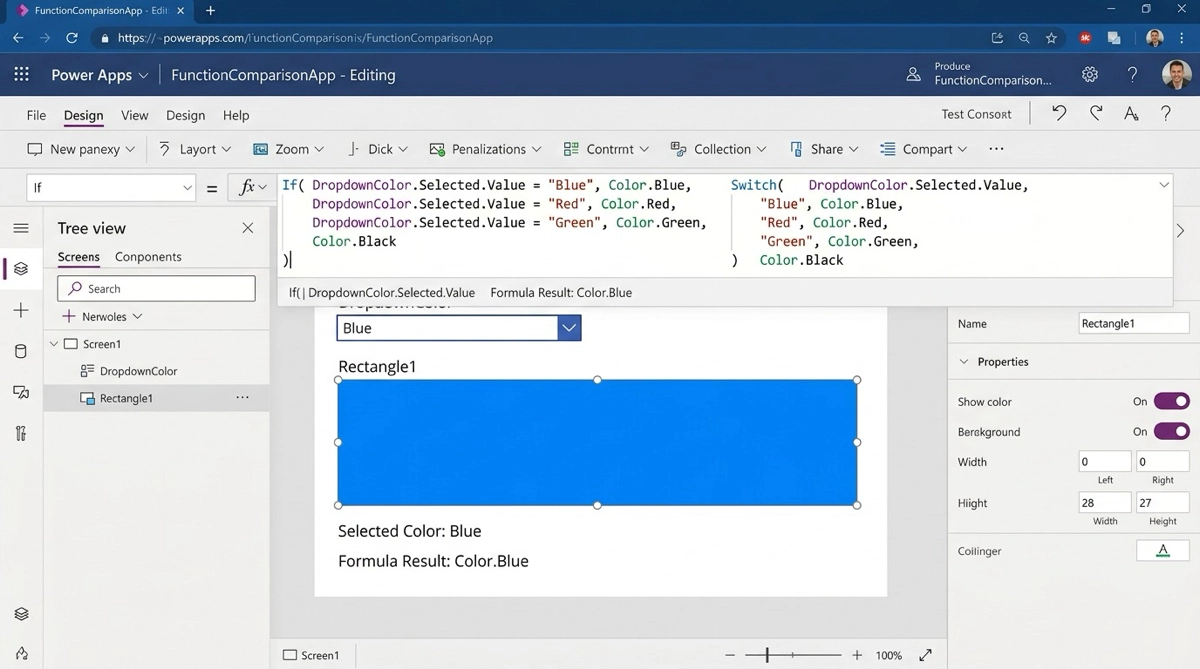 複雑な分岐は変数に結果を入れておくとすっきりします。例えばボタンのOnSelectで条件判断をして変数にセットし、その変数をColorプロパティで参照する、というパターンです。数式の責任範囲が分かれて見通しがよくなります。