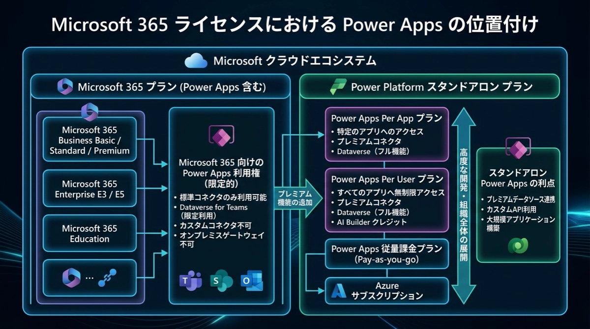 | ① | Microsoft 365 込み | StandardコネクタのみのSharePoint・Teamsアプリ | Microsoft 365に含まれる |