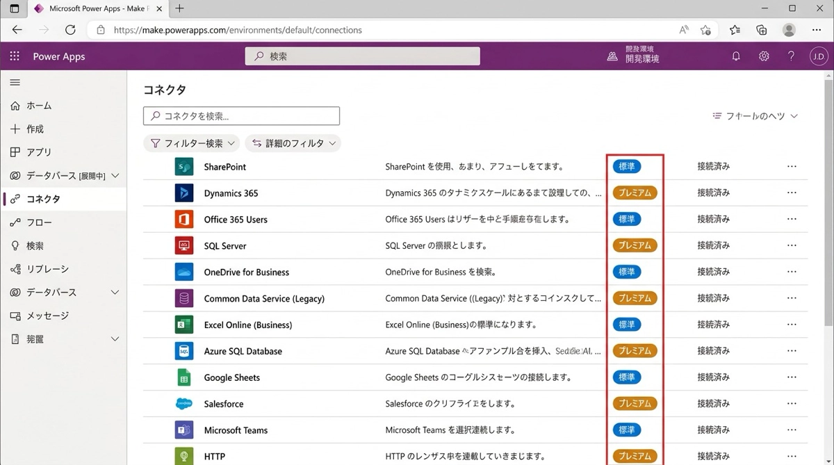 Dataverseをデータソースにしたい場合や、SAP・Salesforceといった外部システムと連携したい場合はPremiumコネクタが必要です。このとき、アプリを使うユーザー全員にPremiumライセンスが必要になります。