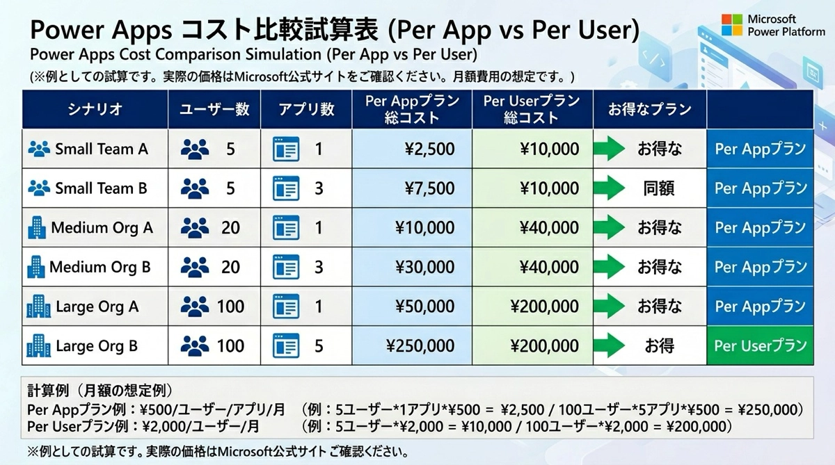 1人が複数のアプリを使う場合はPer User(ユーザー単位)のほうが割安になります。逆に1つのアプリを少人数だけが使う場合はPer App(アプリ単位)が安いこともあります。ユーザー数とアプリ数で試算してから選びましょう。