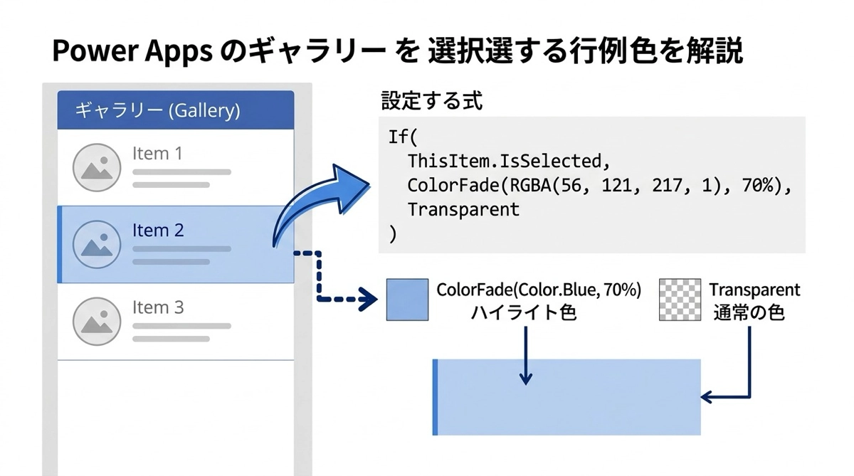 ThisItem.IsSelectedは選択中のアイテムがtrueを返します。見た目が変わるだけで「どの行を選んでいるか」が確認できるので、Patchが意図したレコードに当たっているか把握しやすくなります。ギャラリー系の記事で詳しく紹介していますが、更新系アプリを作るときにも必ず役立つテクニックです。